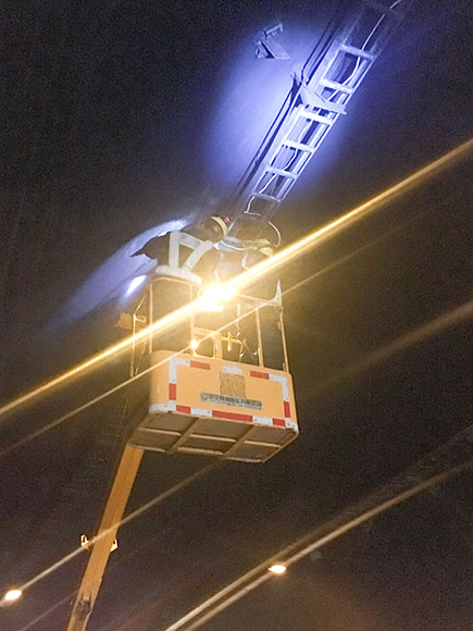 中午11:00,因流量過大,高速交警要求臨時(shí)開放被堵主車道。趁此空隙機(jī)會,中心隊(duì)伍暫撤到黃土嶺隧道管理所解決午餐,之后又馬不停蹄奔赴并集結(jié)在北洞口緊急停車帶,待重新封道后繼續(xù)跟進(jìn)作業(yè),力爭在審批時(shí)間內(nèi)做更多的維修。考慮到主車道燈具損壞不多,抽調(diào)一組登高車人員負(fù)責(zé)攝像頭檢修工作,而底下人員則負(fù)責(zé)修復(fù)更換消防、緊急電話等標(biāo)志燈,每組人員都在與時(shí)間賽跑,忙的顧不上喝水。