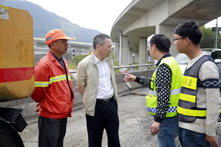 圖為集團(tuán)副董事長、總經(jīng)理張建平在攻堅養(yǎng)護(hù)施工現(xiàn)場檢查