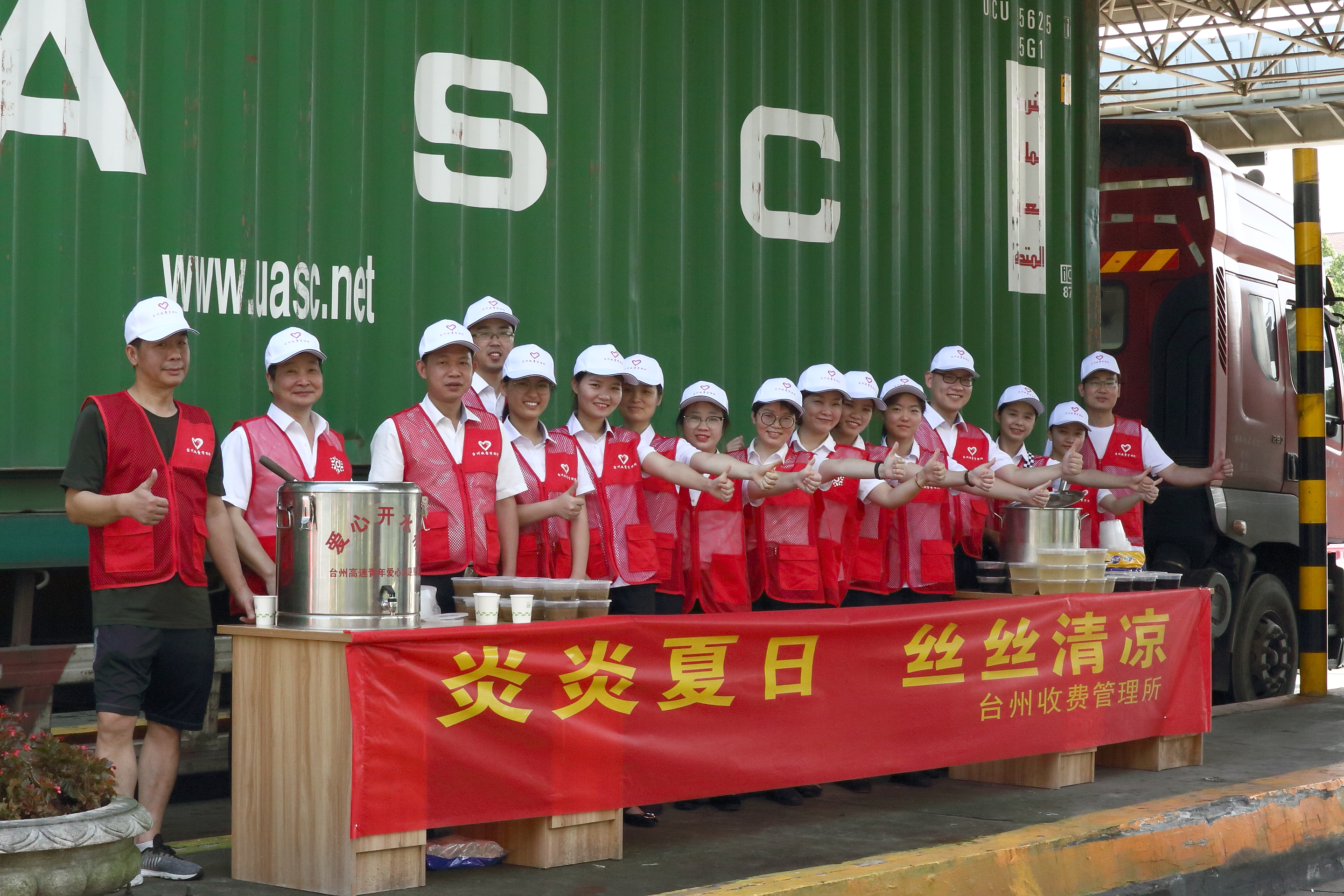86日,臺州收費所開展“炎炎夏日 絲絲清涼”夏日送清涼志愿服務活動。在氣溫日益升高的三伏天里,為過往司乘人員送去絲絲清涼。