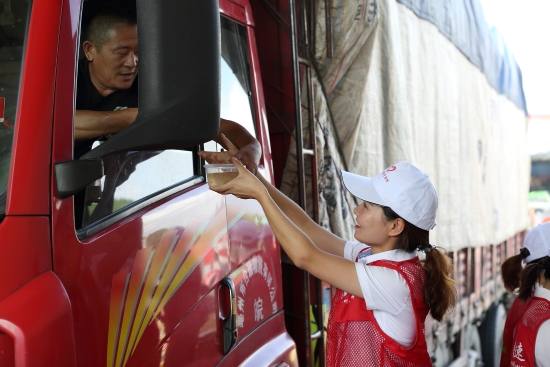 圖為志愿者給司乘遞上飲品