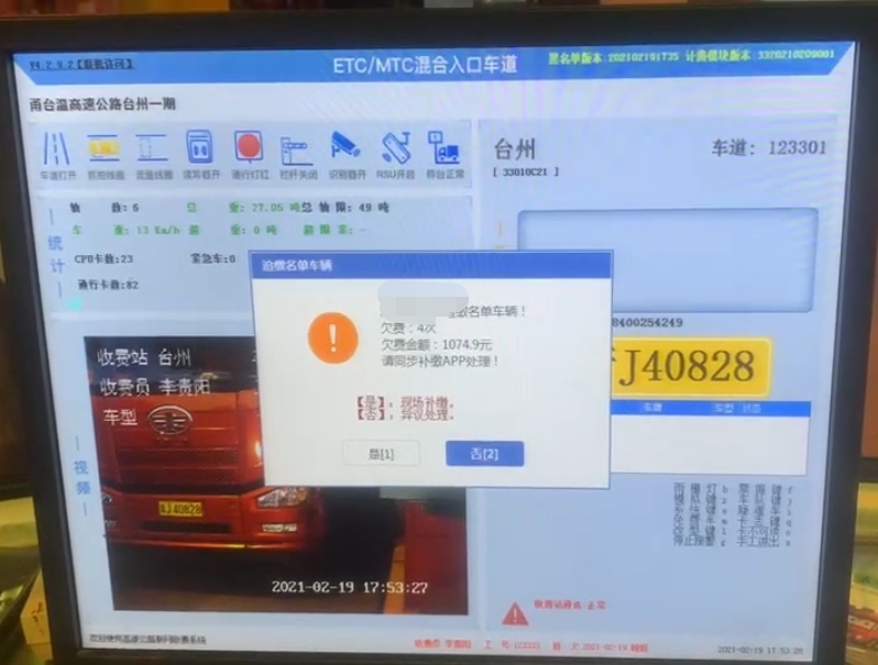 自取消省界收費(fèi)站全國(guó)高速公路聯(lián)網(wǎng)后,跨省追繳通行費(fèi)一直是個(gè)大難題,不少司機(jī)的省外通行費(fèi)因無(wú)法追繳,造成通行費(fèi)不斷流失。交通部為了適應(yīng)“全國(guó)一張網(wǎng)”稽核業(yè)務(wù)工作需要,確保各收費(fèi)站現(xiàn)場(chǎng)有序處理追繳名單車(chē)輛,避免造成社會(huì)輿情和人身財(cái)產(chǎn)安全事件,研發(fā)了全國(guó)稽核通行費(fèi)補(bǔ)費(fèi)系統(tǒng)。 2月19日晚17點(diǎn)50分左右,臺(tái)州收費(fèi)所進(jìn)口迎來(lái)一輛車(chē)牌為浙J開(kāi)頭的六類貨車(chē),車(chē)道屏幕顯示為“浙J XXXXXX追繳名單車(chē)輛,欠費(fèi)4次,欠費(fèi)金額1074.9元,請(qǐng)同步補(bǔ)繳APP處理。”當(dāng)班收費(fèi)員見(jiàn)此詢問(wèn)駕駛員是否欠費(fèi),并喊來(lái)當(dāng)班班長(zhǎng)張錚過(guò)來(lái)處理。