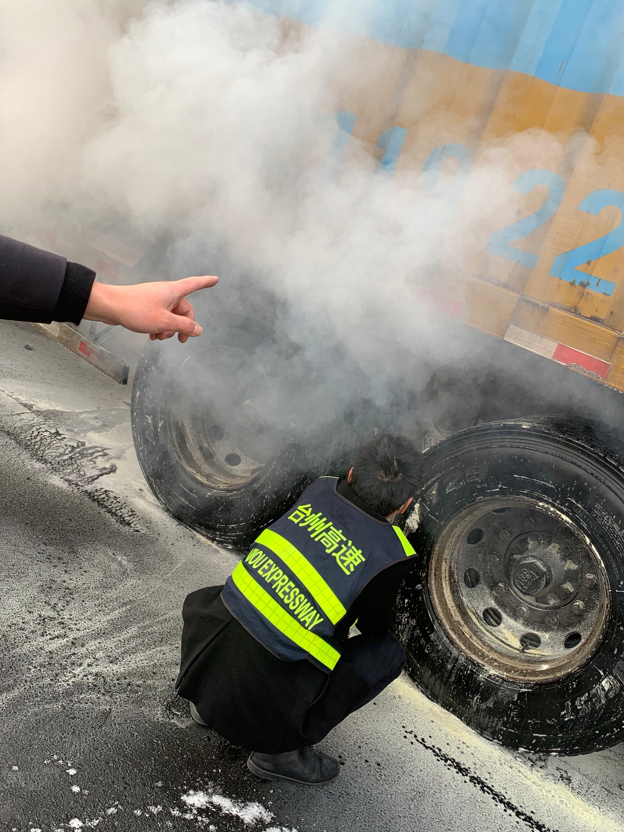 “嘭……35日早上7:35分左右,臺州收費所傳來一聲巨響一輛車牌字開頭的大貨車緩緩駛來,其車廂后輪胎冒火光,隨之白煙滾滾升起,駕駛員卻渾然不知,一路行駛。