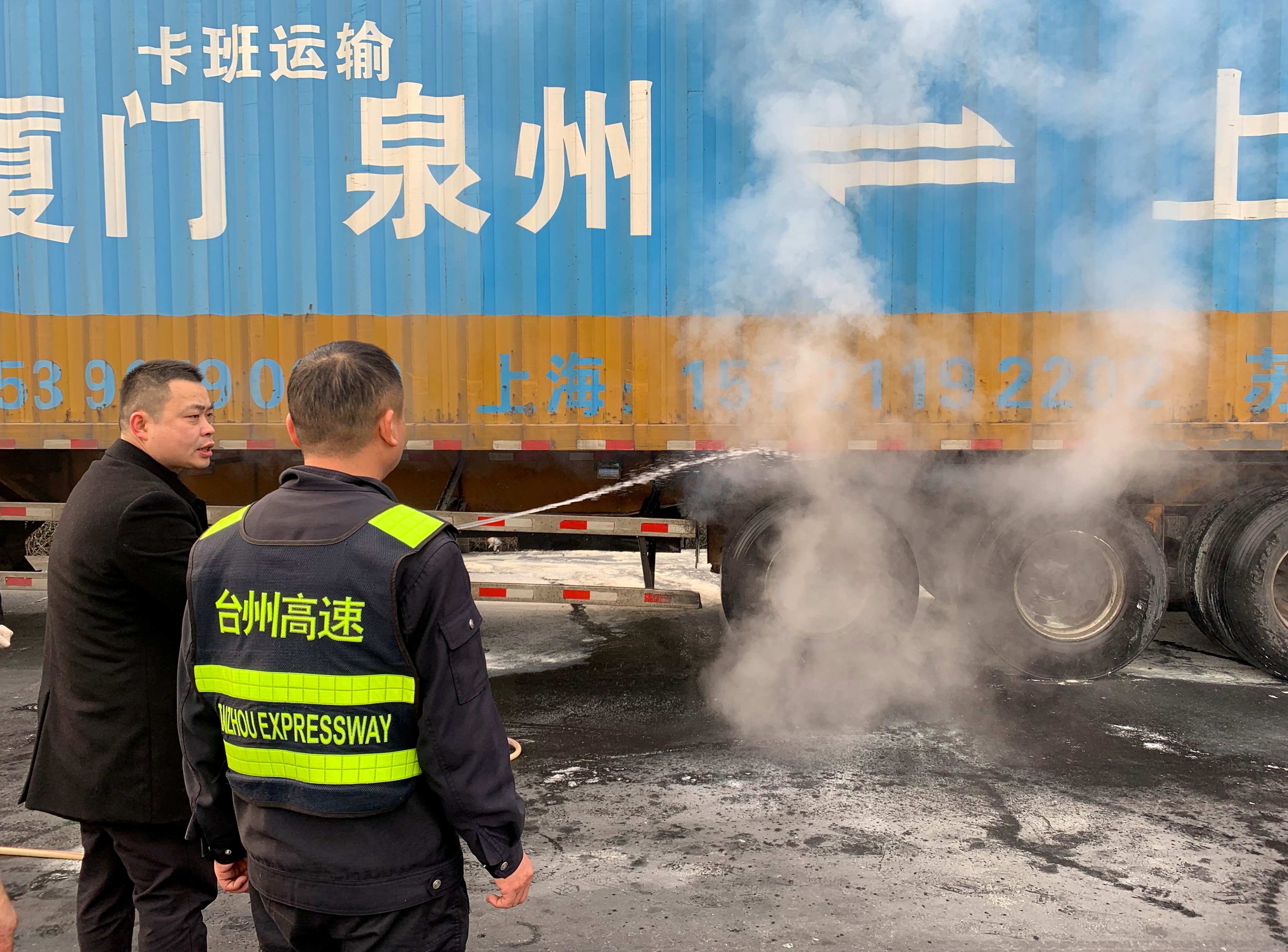 就在這時,突然又一聲巨響, 貨車輪胎發生二次爆炸,火苗再次復燃。大家絲毫不畏懼,提起滅火器對準著火點,快準狠,火苗再次被撲滅。現場,輪胎處還冒著白煙,監控中心何先林提議利用車道上的兩根水管的水對車輛輪胎進行沖水降溫,避免再次發生爆炸。