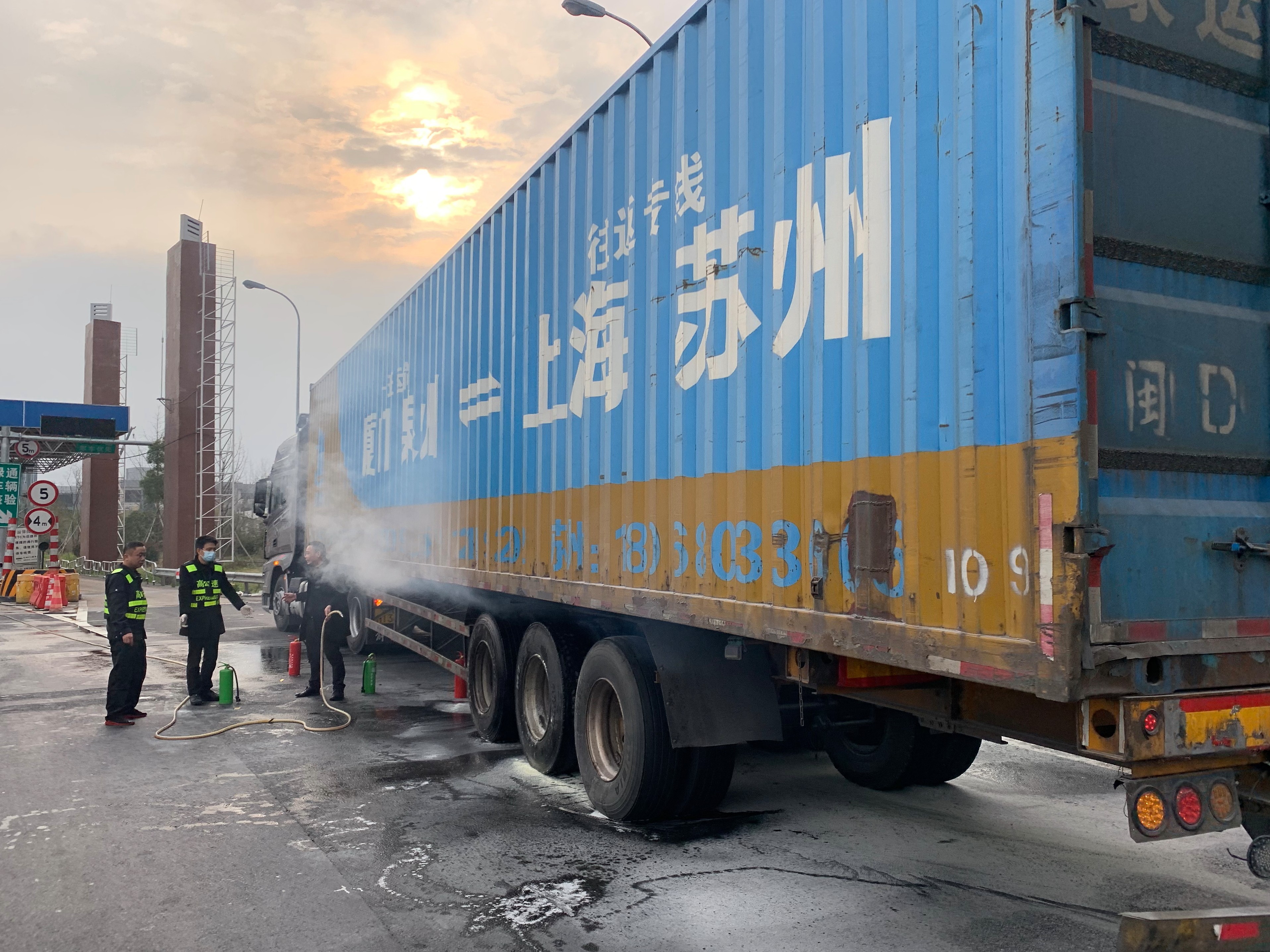 “停車,停車,輪胎起火了。”收費員盧靜對著貨車不停搖手,喊話,貨車駕駛員才發現情況,在內廣場附近停下來。