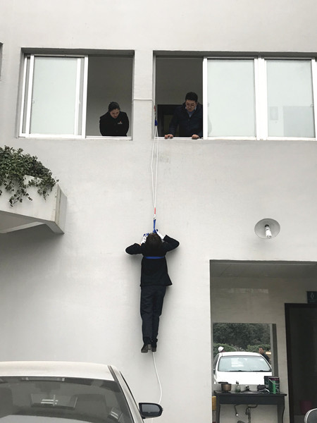 一切準(zhǔn)備就緒,該收費(fèi)員迅速爬上窗戶,利用逃生繩小心地沿著墻壁下滑,并順利落地。教官最后根據(jù)演練情況作點(diǎn)評(píng)。