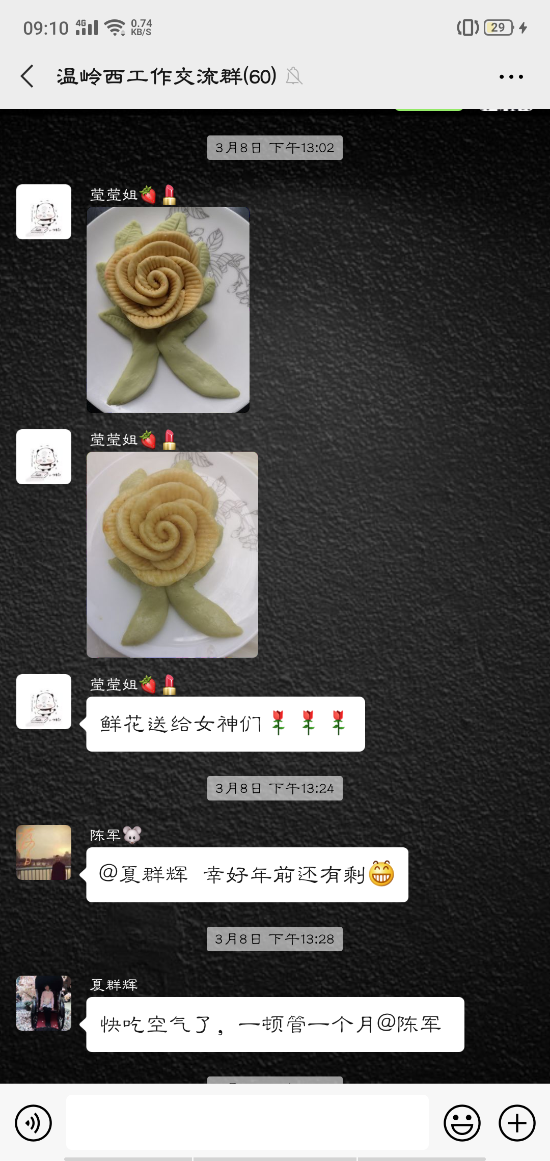 活動中,大家的參與性都很高,紛紛在微信群內曬出自己制作的美食:鹽焗雞可樂雞翅、蔥油角角魚、溫嶺小吃豬肉飯、玫瑰南瓜饅頭……紛紛亮出了自己的拿手好菜在群里談論得熱火朝天的同時,也不忘介紹一下自己做的菜甚至很多男同事也紛紛曬出自己的最佳廚藝,祝福女同胞節日快樂