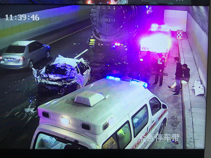 圖為事故現(xiàn)場 情況緊急,一接到指令,巡邏車立即在南廣場調(diào)頭,趕赴事故現(xiàn)場。而此時較大的車流量已造成后方堵車,導(dǎo)致巡邏車被堵在隧道口,執(zhí)勤隊員怕時間耽擱太久,便火速跑到事故現(xiàn)場,第一時間將車?yán)锏娜藛T救出。所幸轎車內(nèi)四人只有一人腳上受傷,中控立即拔打120急救電話。在他們還在施救的時候,追尾事故卻頻頻發(fā)生,500米左右、1300米左右的超車道上先后發(fā)生兩小車、三車追尾事故,隧道內(nèi)排起了長龍。為了保證在最短時間內(nèi)恢復(fù)正常通行,執(zhí)勤隊員忙著奔赴現(xiàn)場指揮預(yù)警,應(yīng)急救援有序展開。 現(xiàn)場,監(jiān)控中心、交警、執(zhí)勤隊等部門分工協(xié)作,整個施救過程一直持續(xù)到中午12點多才順利完成。盡管執(zhí)勤隊員到現(xiàn)在都滴水未進,但每個人臉上繃緊的神經(jīng)終于都得到了放松。 林玲