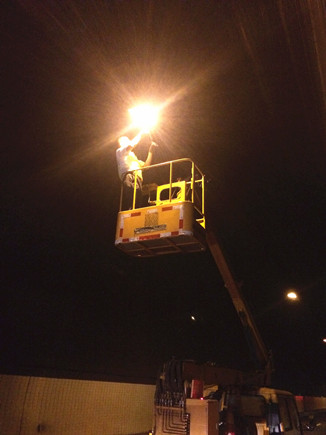 圖為工作人員正在拆除被刮落的燈