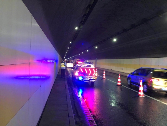 7月14日19時(shí)22分,中控員朱金飛發(fā)現(xiàn)黃土嶺寧向隧道1000米快車道處有車拋錨。立刻呼叫執(zhí)勤隊(duì)前往處置,隨即更改快車道交通信號(hào)。 執(zhí)勤隊(duì)迅速出警,幾分鐘后就趕赴事故現(xiàn)場,發(fā)現(xiàn)一輛白色面包車撞在隧道內(nèi)右側(cè),車輪箍嚴(yán)重受損,卡在護(hù)溝里,所幸無人員受傷。執(zhí)勤隊(duì)進(jìn)行提前預(yù)警,預(yù)防二次事故的發(fā)生,并呼叫高速施救車輛支援,幾分鐘后施救車抵達(dá),事故車輛安全拖離隧道,僅僅十分鐘,交通就恢復(fù)暢通。