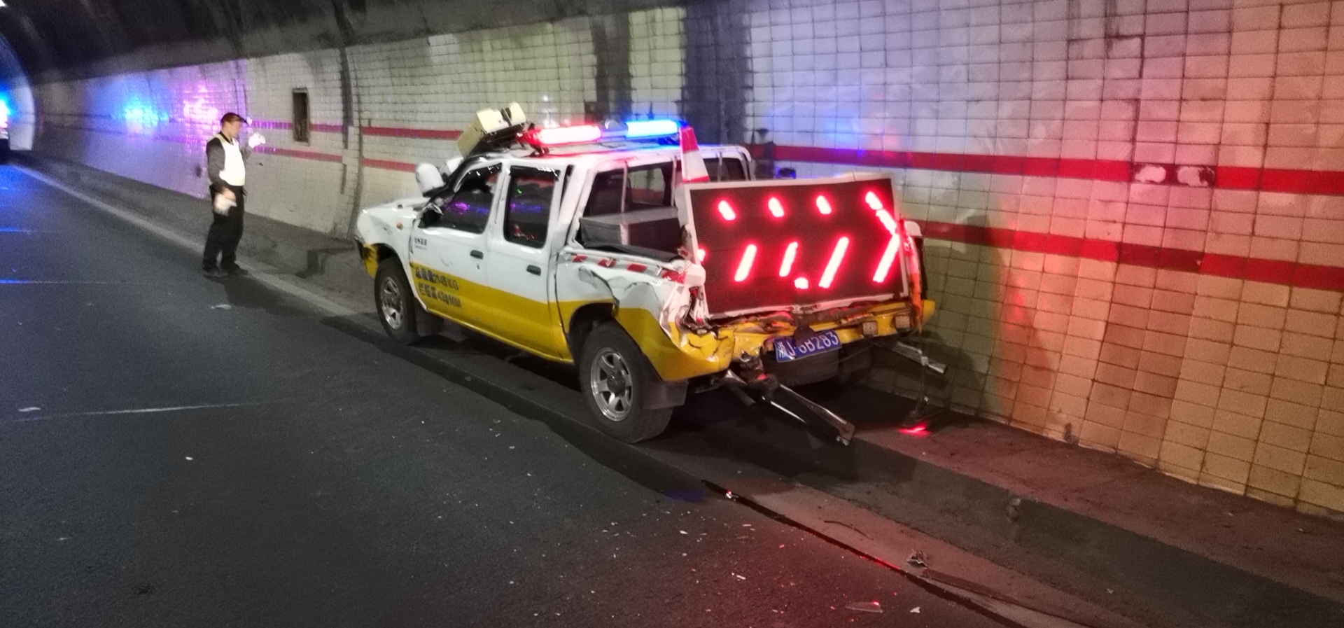 此次事故造成三車追尾,兩名執勤隊員輕微受傷,雖然巡邏車損失慘重,但是因為執勤隊員高度的工作責任心和對險情的正確判斷處置,才未造成任何司乘人員傷亡,也未影響隧道正常通行