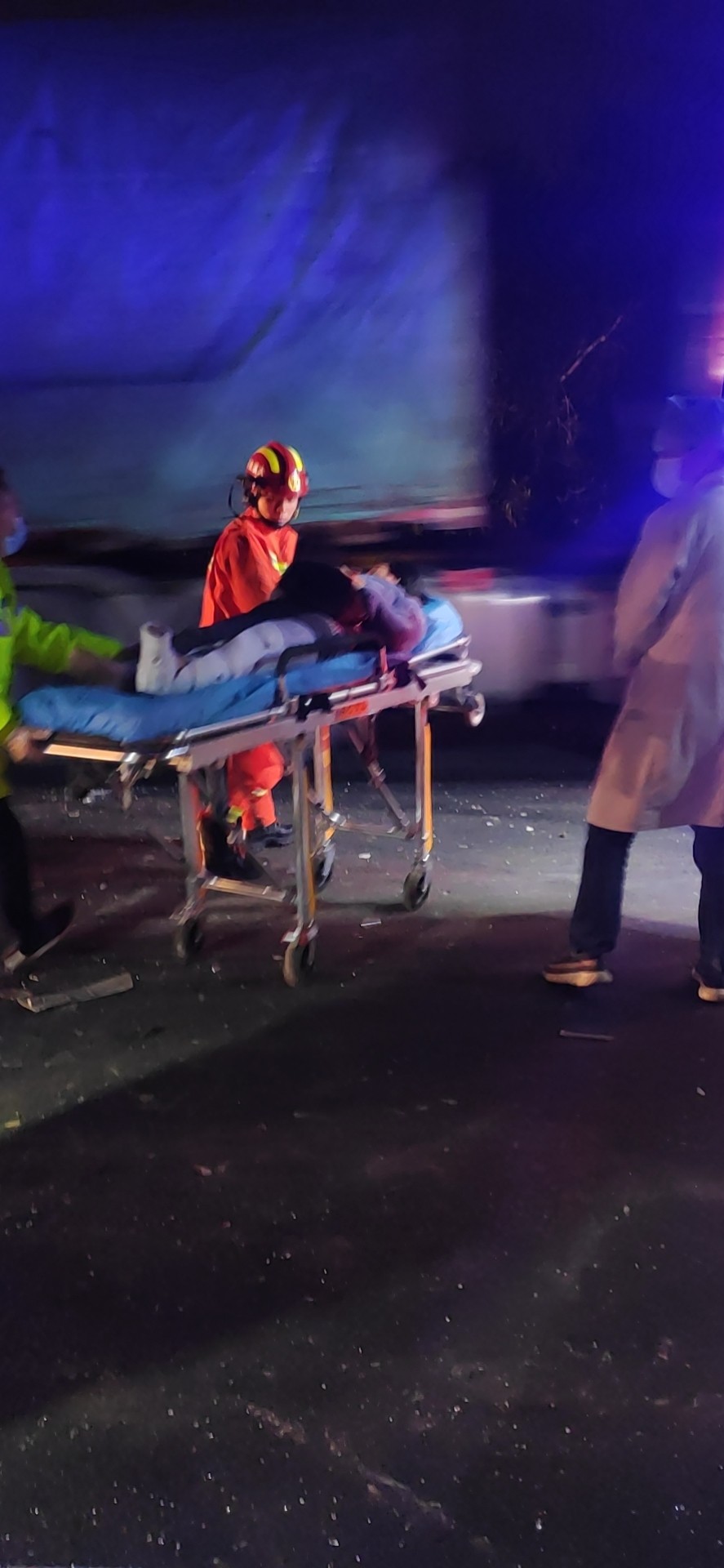 22:00第一輛救護車到達。醫護人員準備擔架,另一名醫生去詢問坐在地上的受傷人員,由于車頭嚴重變形,司機與鄰座的人都被卡在駕駛室,經過消防員的救援,受傷最嚴重的司機首先被救了下來,在被救下的那刻暈了過去,醫護人員立該把傷員抬上救護車,緊接著消防員救下第二位被卡傷員,第二輛救護車帶著傷員離開,最后一輛救護車卻遲遲沒到,經聯系監控中心后得知救護車已上高速,但因后方車輛太多,救護車和拖車都被堵了,經和臺州高速交警協商后,最后清理一個車道讓救護車和拖車先開上來,巡邏車去事故車后方預警,22:30救護車帶走最后一名傷員,事故車被拖走,路面恢復正常通車。