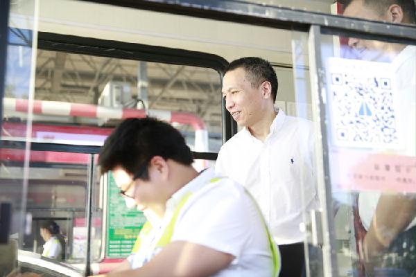 圖為集團副董事長、總經(jīng)理張建平在溫嶺西收費崗?fù)z查