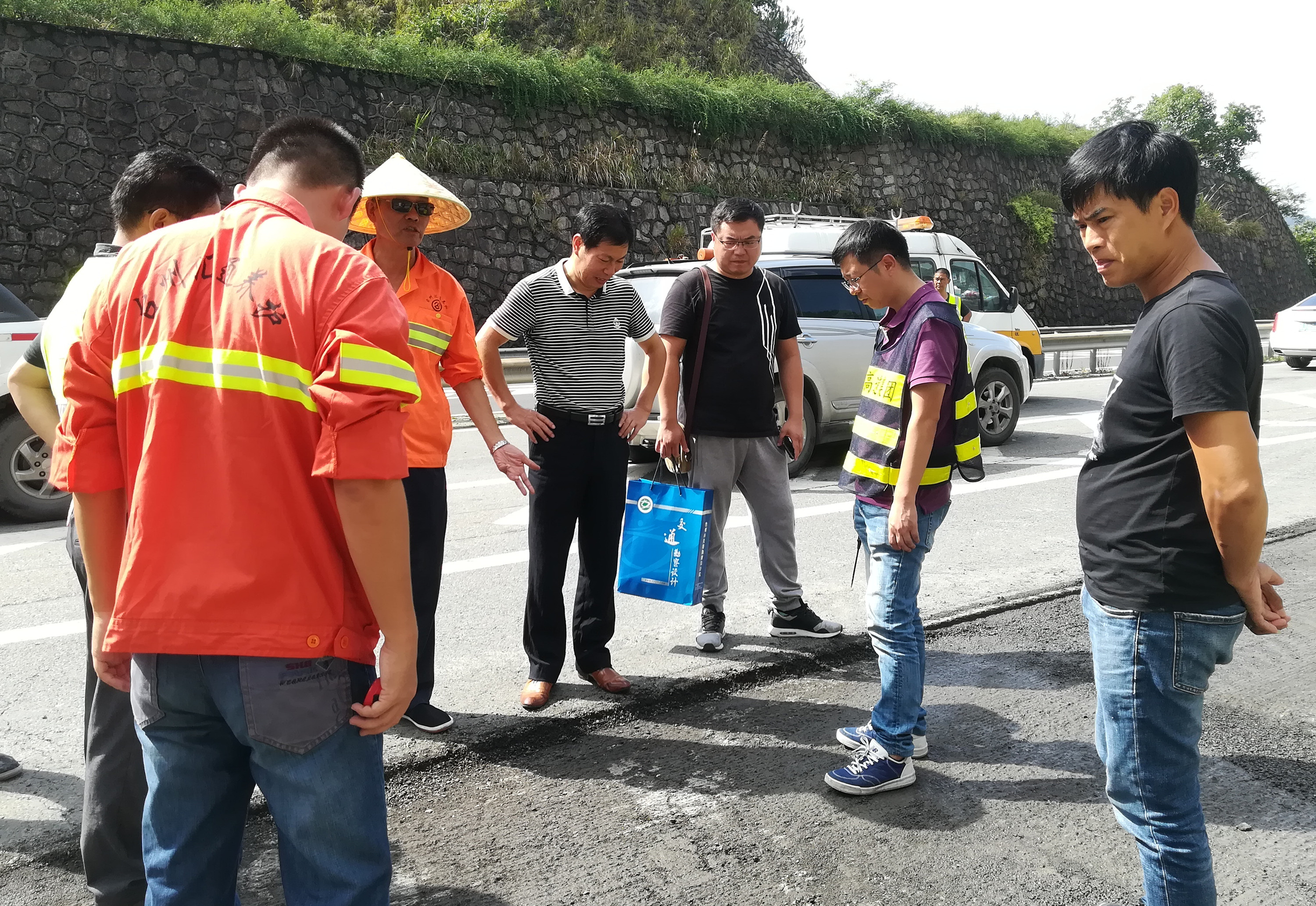 圖為集團(tuán)總工程師江輝與相關(guān)人員在現(xiàn)場協(xié)商病害處置方案 根據(jù)施工方反應(yīng),臨海南匝道段瀝青路面病害較為嚴(yán)重,江輝一行即刻邀請路面專項(xiàng)工程設(shè)計(jì)方共同到現(xiàn)場,仔細(xì)檢查瀝青路面病害情況,并根據(jù)病害程度,裂縫、車轍等情況協(xié)商確定相應(yīng)的專項(xiàng)處置方案,以便更好地開展路面維修工作。