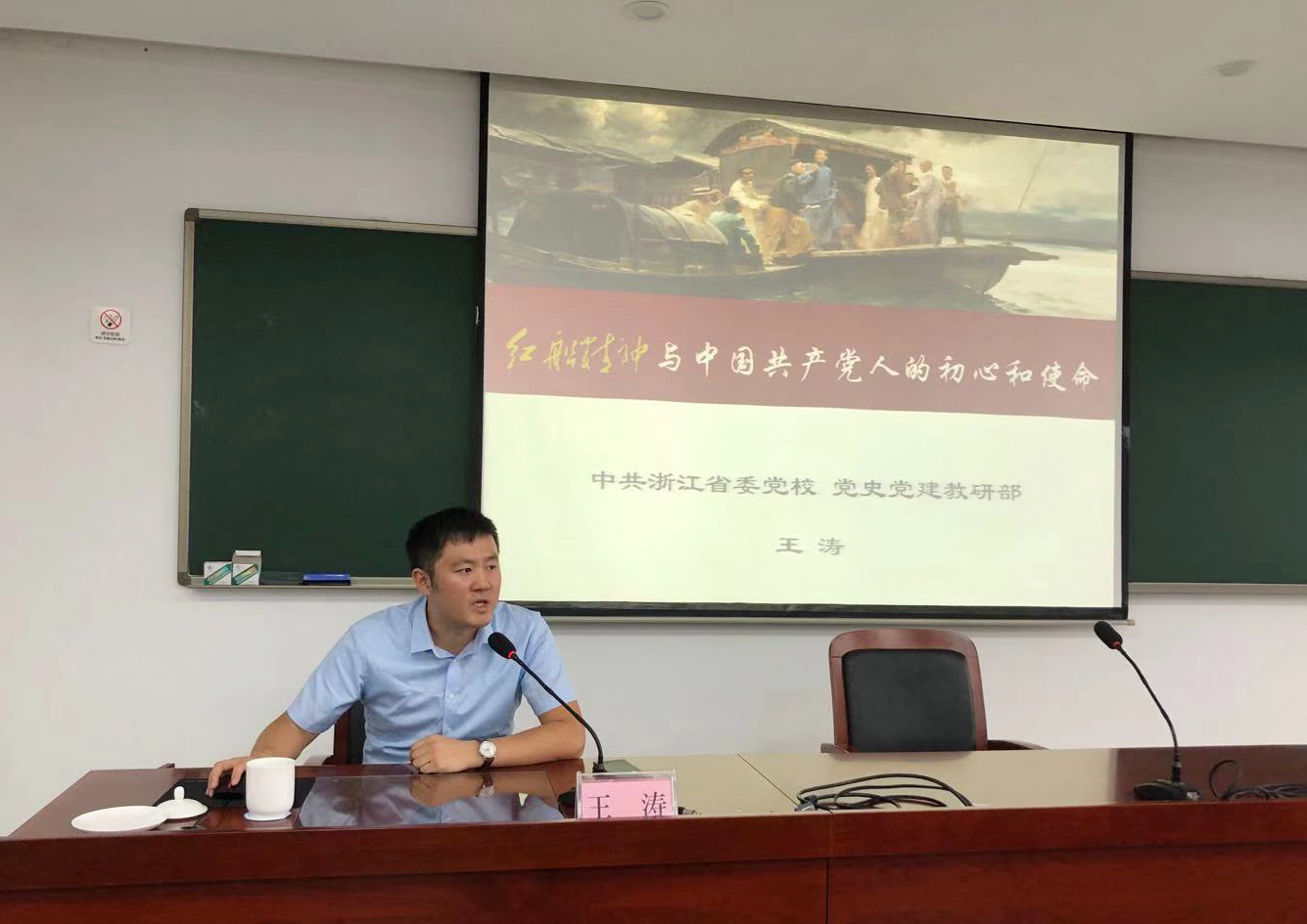 圖為省委黨校黨史黨建教研部博士王濤 以《弘揚紅船精神 不忘初心使命 》為題授課