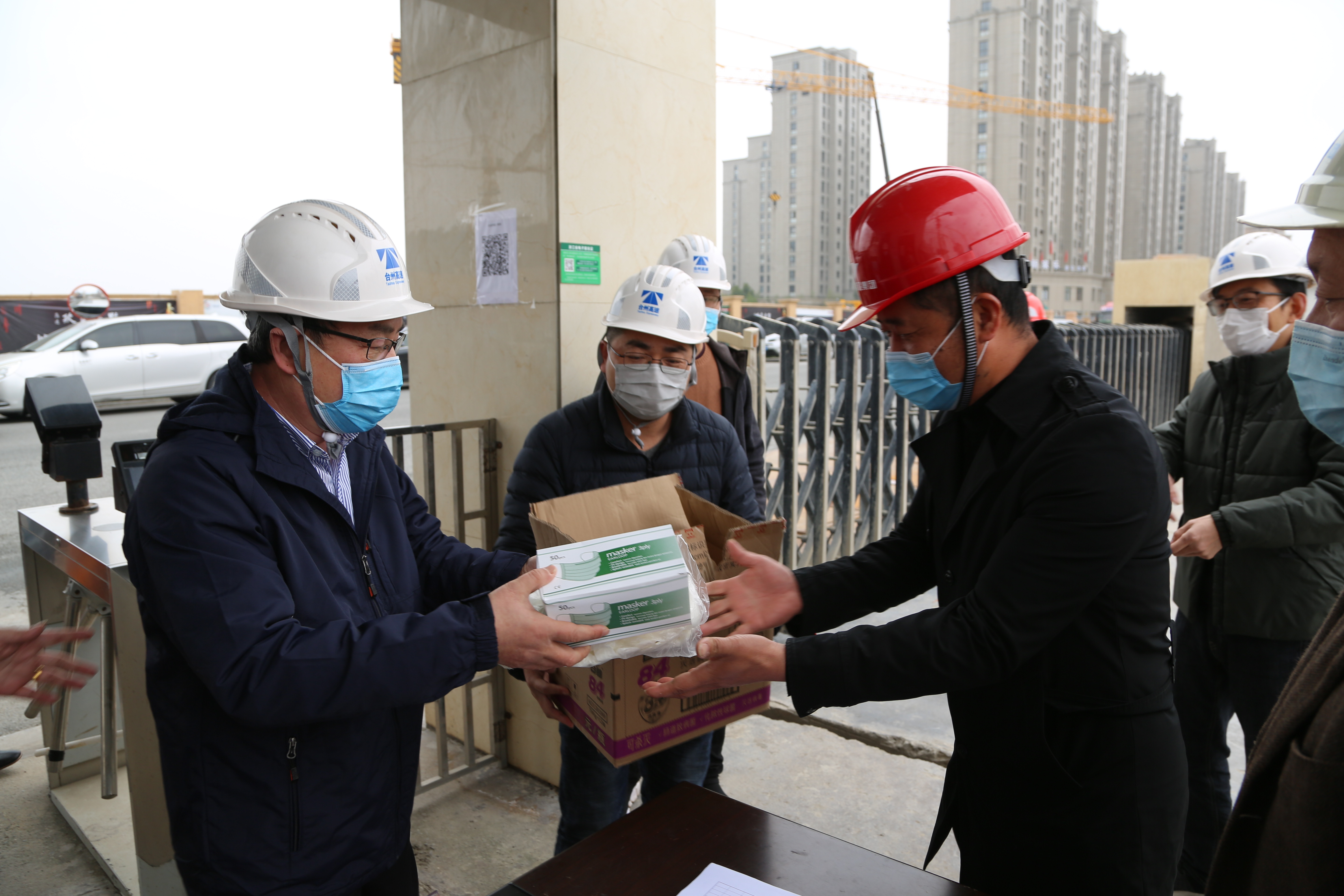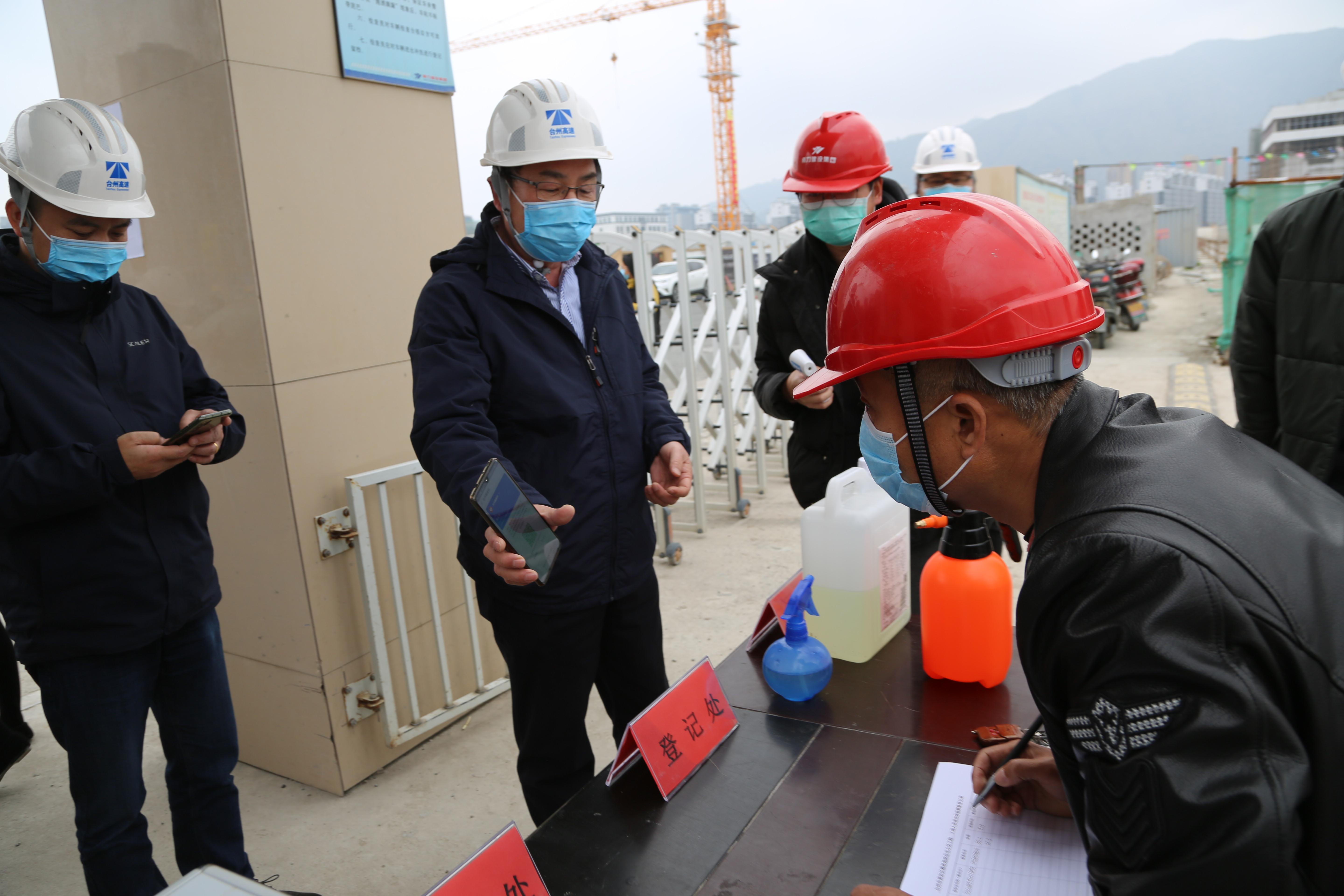 “這是我的綠碼?!迸_(tái)州高速集團(tuán)黨委書記、董事長、總經(jīng)理陳文波主動(dòng)向黃巖玖璽逸墅項(xiàng)目施工工地的防疫人員出示自己的綠碼。經(jīng)過測體溫、登記、檢查綠碼、消毒等防疫流程,陳文波一行進(jìn)入施工工地。