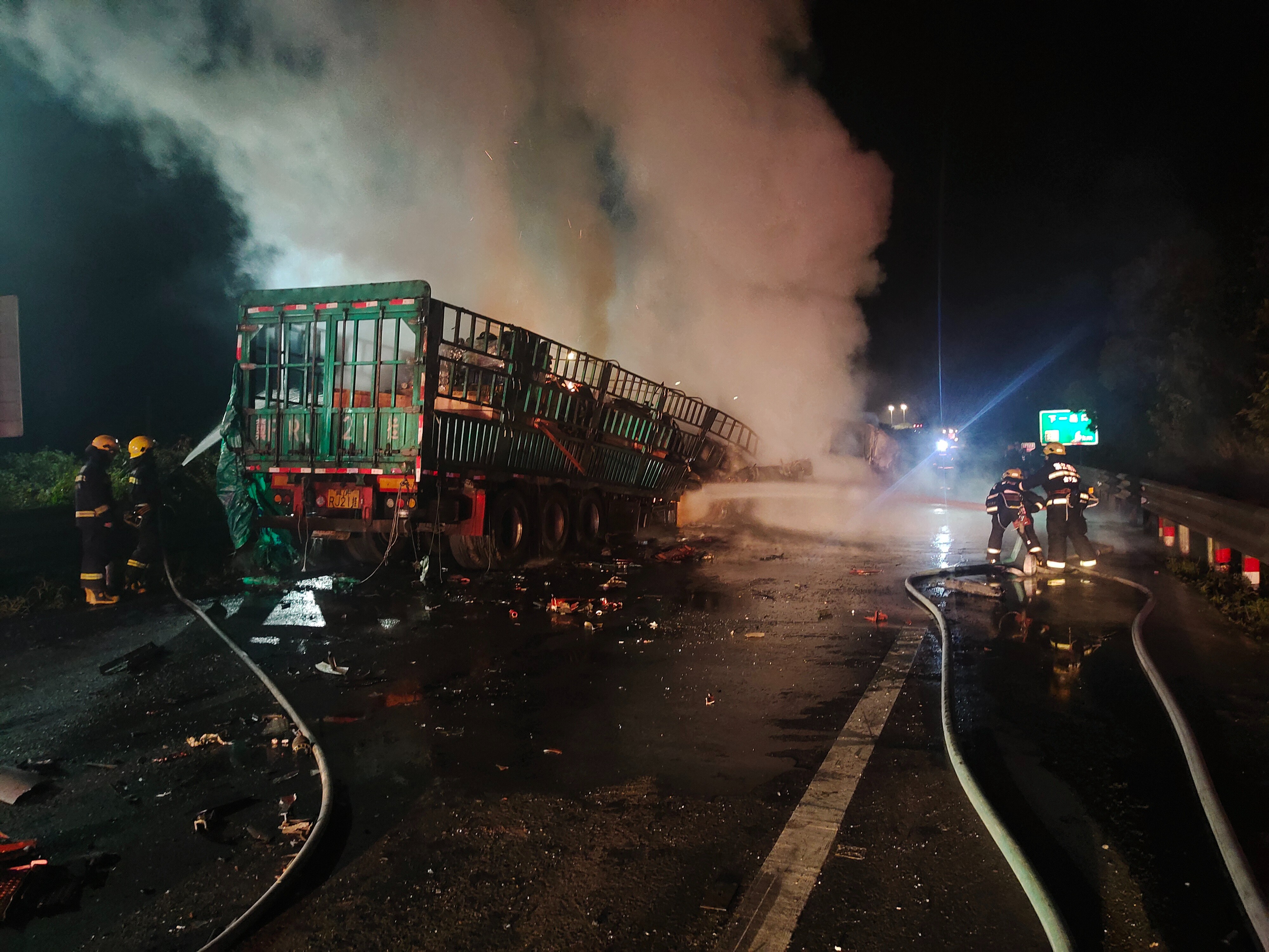 421日凌晨2G15沈海高速甬臺溫段寧波方向距離黃土嶺隧道不到2公里的地方,一輛半掛車與前車發生追尾事故,隨后起火燃燒。