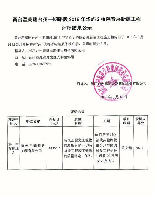 甬臺溫高速臺州一期路段2018年華峪2橋隔音屏新建工程評標結(jié)果公示