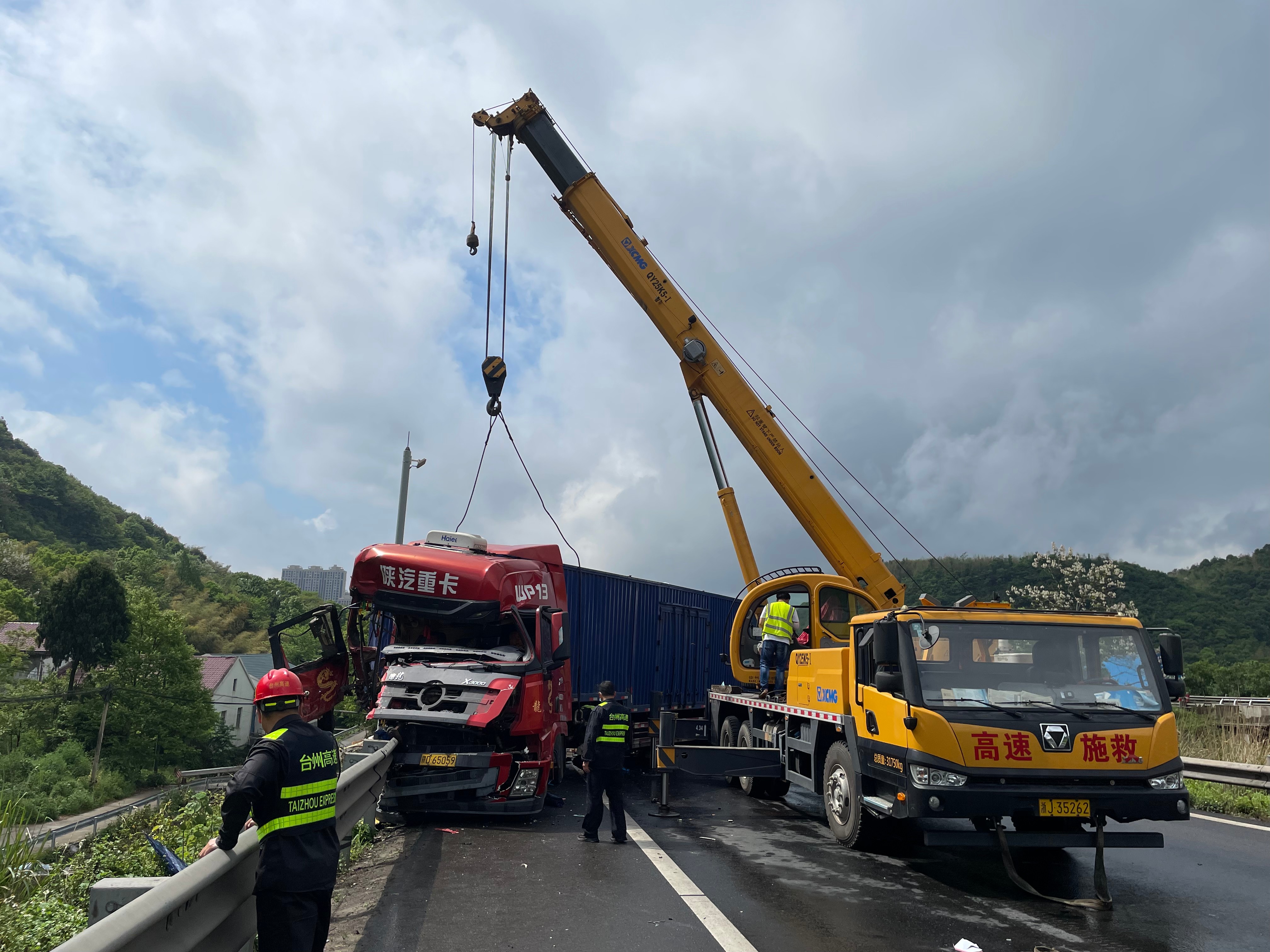 聽(tīng)到巨響的黃土嶺隧道所工作人員立刻提高警惕,啟動(dòng)應(yīng)急預(yù)案,所負(fù)責(zé)人應(yīng)錦清帶領(lǐng)執(zhí)勤隊(duì)員迅速出動(dòng)到達(dá)事故現(xiàn)場(chǎng),執(zhí)勤隊(duì)員第一時(shí)間在事故車后方預(yù)警,以防二次事故。因大貨車車身橫在路面,可通行的道路僅留2米多寬,周圍一下子便開(kāi)始擁堵。執(zhí)勤隊(duì)、施救人員聯(lián)合高速交警指揮交通,讓后方無(wú)法通行的貨車暫時(shí)排在一側(cè),保證后續(xù)救援暢通。