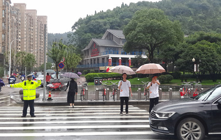 圖為志愿者在十字路口協(xié)助指引車輛通行
