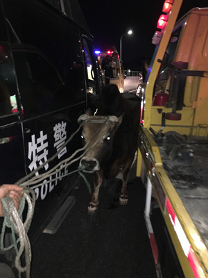 警報拉起,警燈閃爍,猛牛在施救車和巡邏車護送下,走過黃土嶺隧道,并在警車引導下,走向臺州收費所出口。晚7:00時在即將出口時,牛開始受驚,四處突圍,為避免事故,飛速趕過來的臺州110特警擊中了牛蹄,制伏了開始發瘋的牛。費了老大力氣,特警、交警及施救人員總算合力將牛抬上施救車安全帶下了高速公路 。