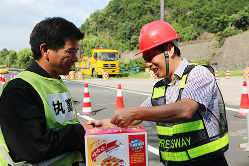 圖為集團總工程師江輝為交通疏導(dǎo)員送上慰問品