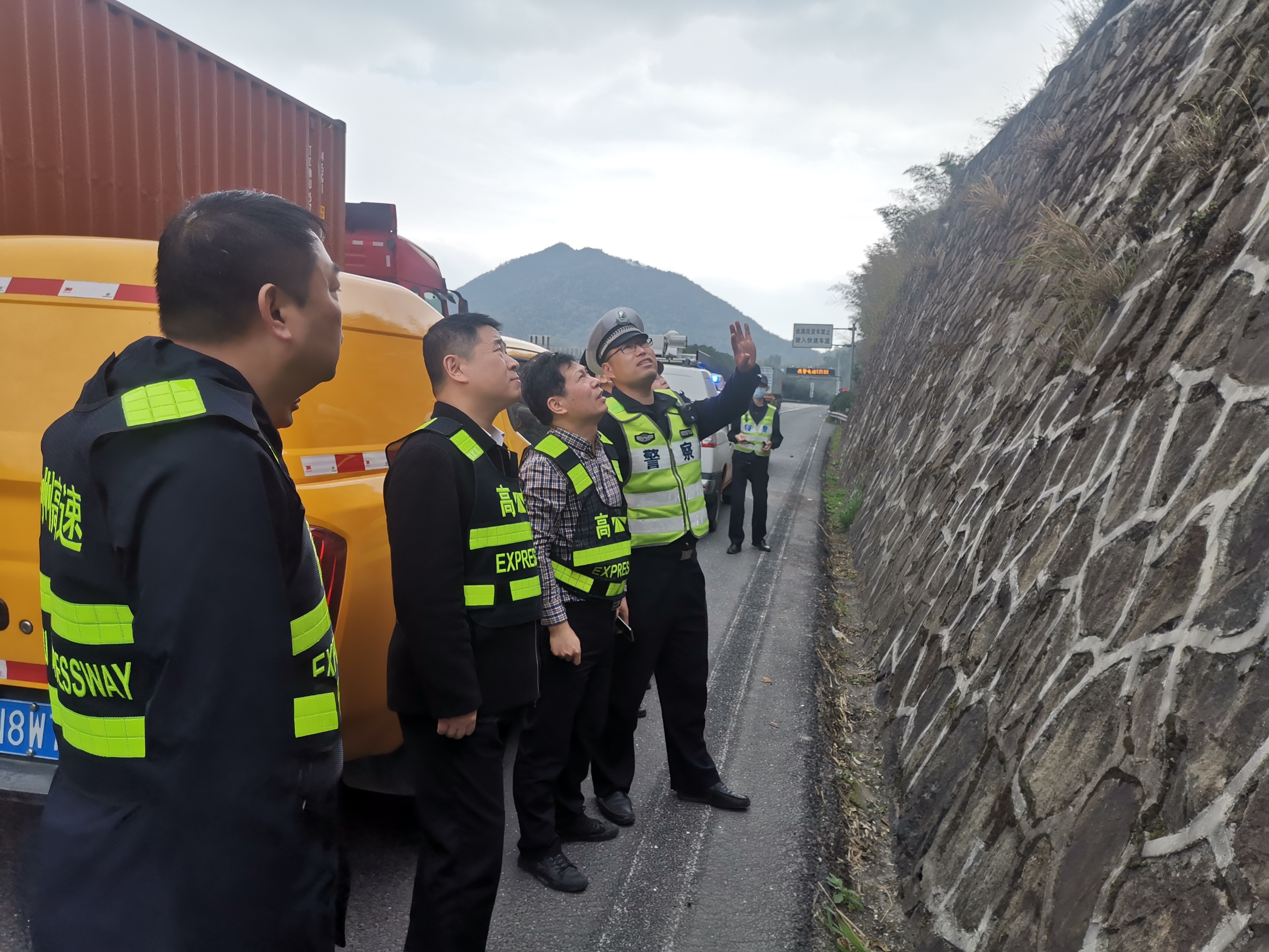 310午,集團總工程師江輝、安全總監項同富帶領工程養護部、安保部人員,聯合高速交警、市交通運輸綜合行政執法隊、匯通養護公司開展汛前沿線安全檢查。