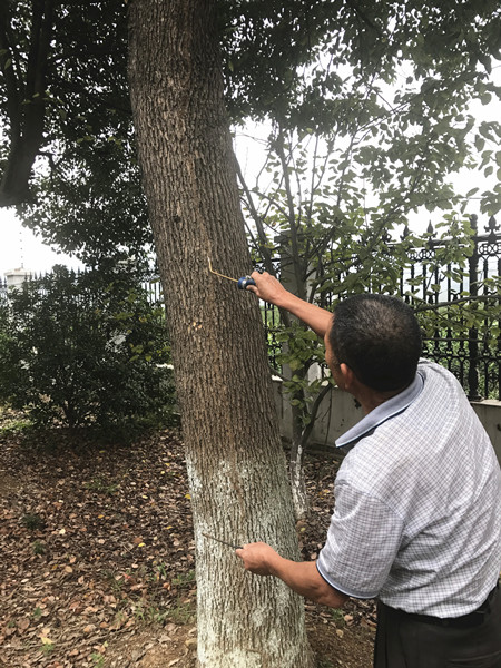 上圖為技術人員在防治白蟻受災處 為全面消除隱患,該所立即組織人員對員工宿舍、綠化帶、辦公樓逐一進行地毯式排查,最終發現三處地方受災最為嚴重,同時在員工宿舍旁綠化帶處找到白蟻窩。該所負責人及時聯系建設局房管處白蟻防疫站技術人員,對樹木、門框等進行防治消殺和用白粉涂擦等方式排除隱患,通過防治消殺和白粉涂擦等方式,有效確保了所內環境的生態資源健康和安全。