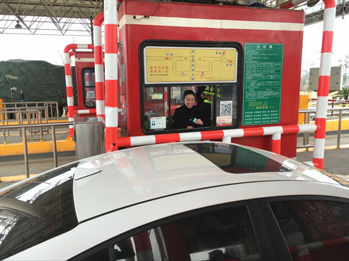 圖為工作人員在收費(fèi)站外廣場(chǎng)引導(dǎo)車(chē)輛有序通行