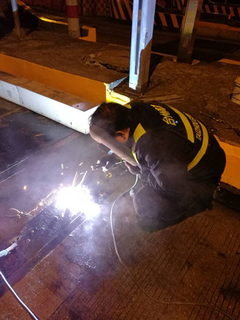 到了現(xiàn)場,隊員發(fā)現(xiàn)該車道輪檢器鐵板螺孔由于不斷摩擦并逐漸變大,導(dǎo)致整顆螺栓脫離底下固定螺座,加之當(dāng)天是春節(jié)高速免費第一天,車輛經(jīng)過時車速都較快,直接將整塊鐵板帶離底座。如果不及時對鐵板進行加工恢復(fù),不僅不能保護下面的輪檢器,而且還有可能造成車輛爆胎。可除夕夜全部加工廠都已關(guān)門,如果讓廠家發(fā)貨至少也要好幾天。正在兩難之際,中心副經(jīng)理葉俊想到將鐵板與底座邊緣直接焊死的臨時應(yīng)急方法,待節(jié)后再向廠家定制或重新購買。 方案有了,大家兵分兩組,一組去中心倉庫拿電焊機、電焊條等設(shè)備,一組待在原地清理鐵底下方於泥等雜物,為隨后的電焊工作做準備。設(shè)備到位后,葉俊一手操起電焊罩,一手熟練的將電焊條點在了鐵板與底座邊緣之間,經(jīng)過近一個小時的處理,輪檢鐵板與地面底座牢牢地固定在一起,再也不用被飛馳而過的車輛帶離。 項寅曉