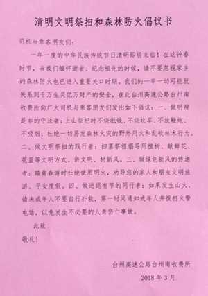 圖為倡議書(shū) 為增強(qiáng)防火意識(shí),做到文明祭掃,3月16日上午,臺(tái)州南收費(fèi)所在向過(guò)往司乘人員發(fā)放《清明文明祭掃和森林防火倡議書(shū)》,倡議大家做明辨是非的守法者:不燒紙錢(qián)、不放鞭炮、杜絕野外用火和亂伐林木行為;做文明祭掃的踐行者:提倡用植樹(shù)、獻(xiàn)鮮花、花籃等方式祭祖;做綠色新風(fēng)的傳遞者:勸導(dǎo)家人和朋友文明出游;做進(jìn)退有節(jié)的同行者:發(fā)生山火,理智救火。