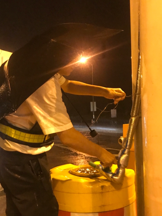 圖為收費員不顧狂風暴雨捆綁水管