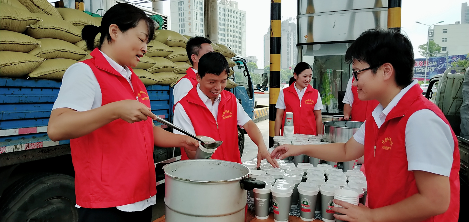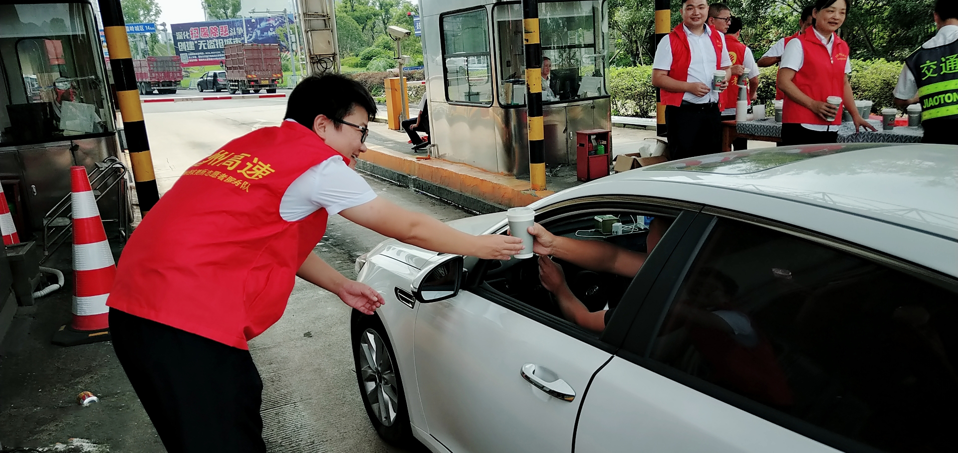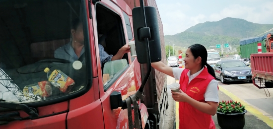 圖為送清涼活動(dòng)現(xiàn)場(chǎng) “師傅,你好,喝一碗冰綠豆湯解解暑吧。” 溫嶺西收費(fèi)所、大溪嶺隧道所黨員帶頭,團(tuán)員響應(yīng),大家主動(dòng)放棄休息時(shí)間,組成志愿服務(wù)隊(duì),頂著高溫在高速出口處為過(guò)往司乘免費(fèi)提供綠豆湯、紅棗湯等飲品,同時(shí)還備足藿香正氣水、風(fēng)油精等解暑藥品,讓廣大司乘在炎炎夏日感受到一絲清涼。當(dāng)司乘人員從志愿者手中接過(guò)一杯杯綠豆湯時(shí),志愿者還不忘提醒司乘高溫酷暑天氣注意行車(chē)安全。面對(duì)“春風(fēng)”般微笑的志愿者,喝著綠豆湯的司乘人員都露出了開(kāi)心的笑容,紛紛豎起大拇指感謝志愿者們的貼心服務(wù)。