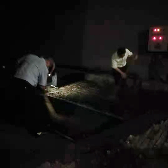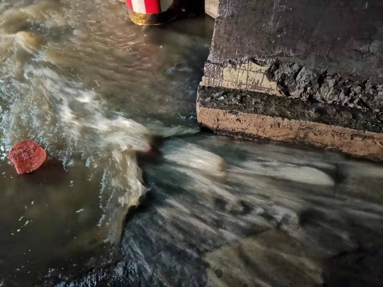 圖為車道水流 當晚19:12分,黃土嶺隧道所中控員徐彤霞發(fā)現(xiàn)寧向隧道主車道路面出現(xiàn)積水,如不及時處置,路面濕滑會讓過往車輛打滑,嚴重影響隧道的安全暢通。為了杜絕安全隱患,管理所立即啟動防汛應急方案,中控員第一時間在管理群發(fā)送現(xiàn)場圖片,并在同一時間通知執(zhí)勤隊與監(jiān)控中心。 執(zhí)勤隊員不顧狂風暴雨趕赴現(xiàn)場,19:19分,斜井現(xiàn)場山上倒灌入隧道的水嘩嘩直流,儲水池水流急促,執(zhí)勤隊員立即分工合作,一組在主車道擺放安全錐采取防護措施,并利用沙包,堵住排水溝壁,使水盡量不往外滲,及時避免了積水對隧道內行車造成的安全隱患。一組檢查潛水泵是否正常運行,查看積水入侵的原因、排水溝通暢情況。