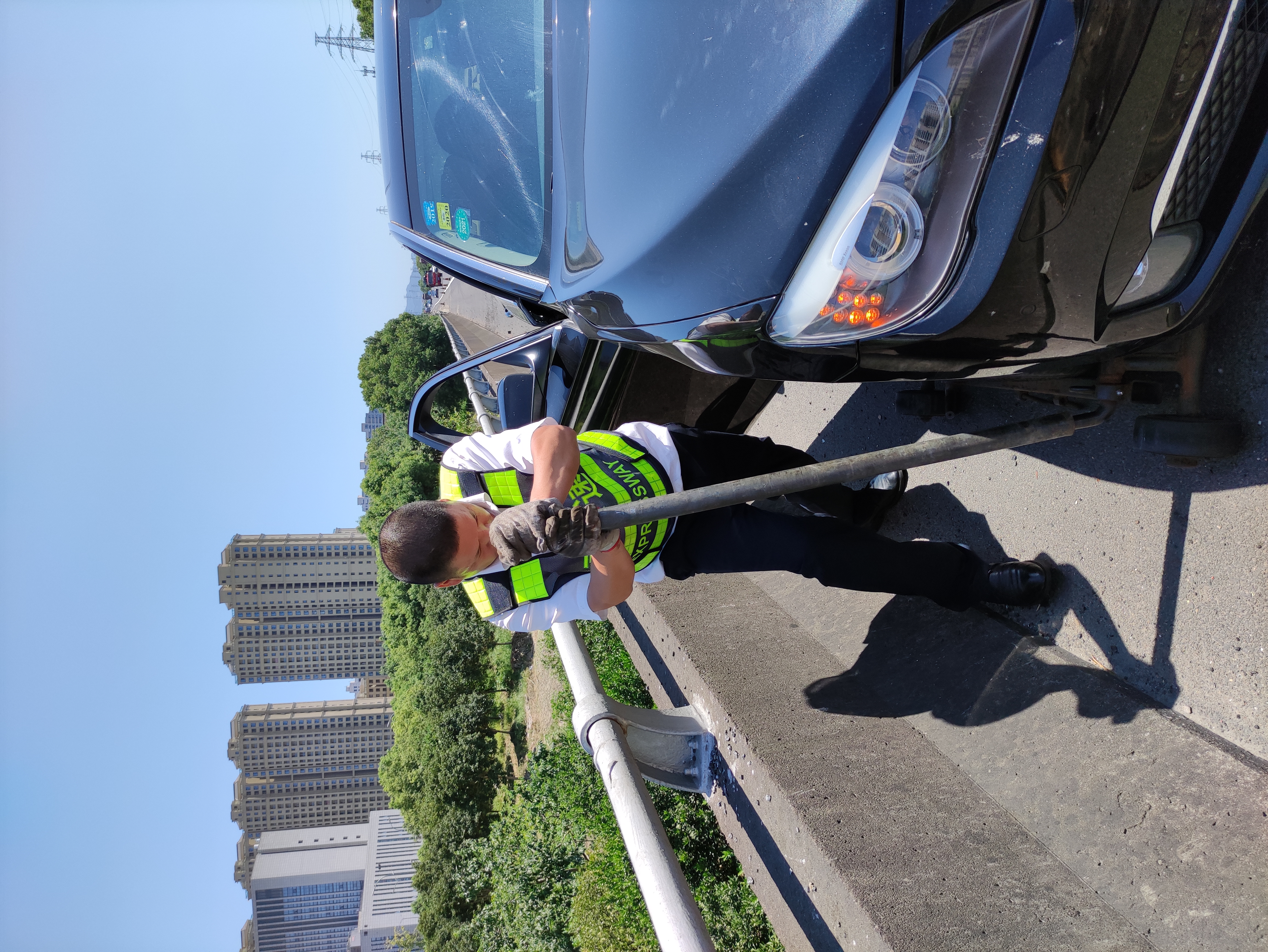 險情就是命令,兩人拼著命咬著牙堅持著,用撬棍把四個輔助輪都安裝好,把車輛安全帶離高速。