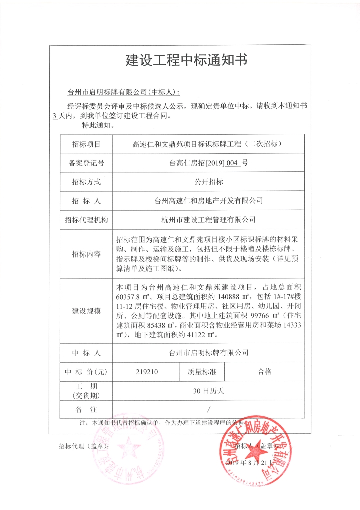 高速仁和文鼎苑項目標識標牌工程中標通知書