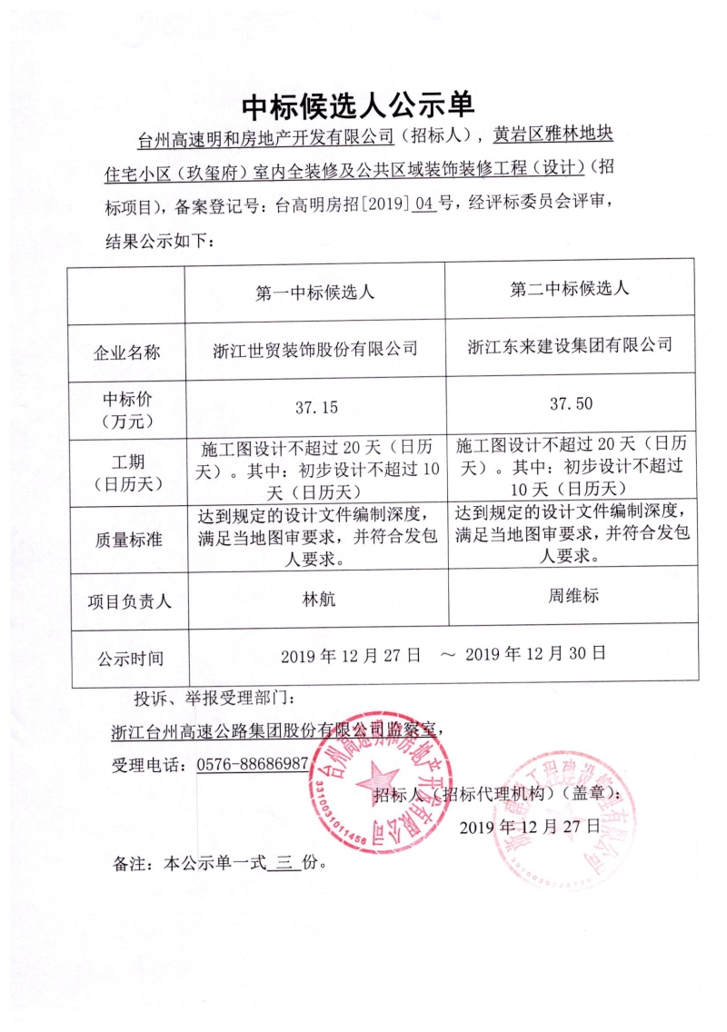 黃巖區雅林地塊住宅小區(玖璽府)室內全裝修及公共區域裝飾裝修工程(設計)中標候選人公示單