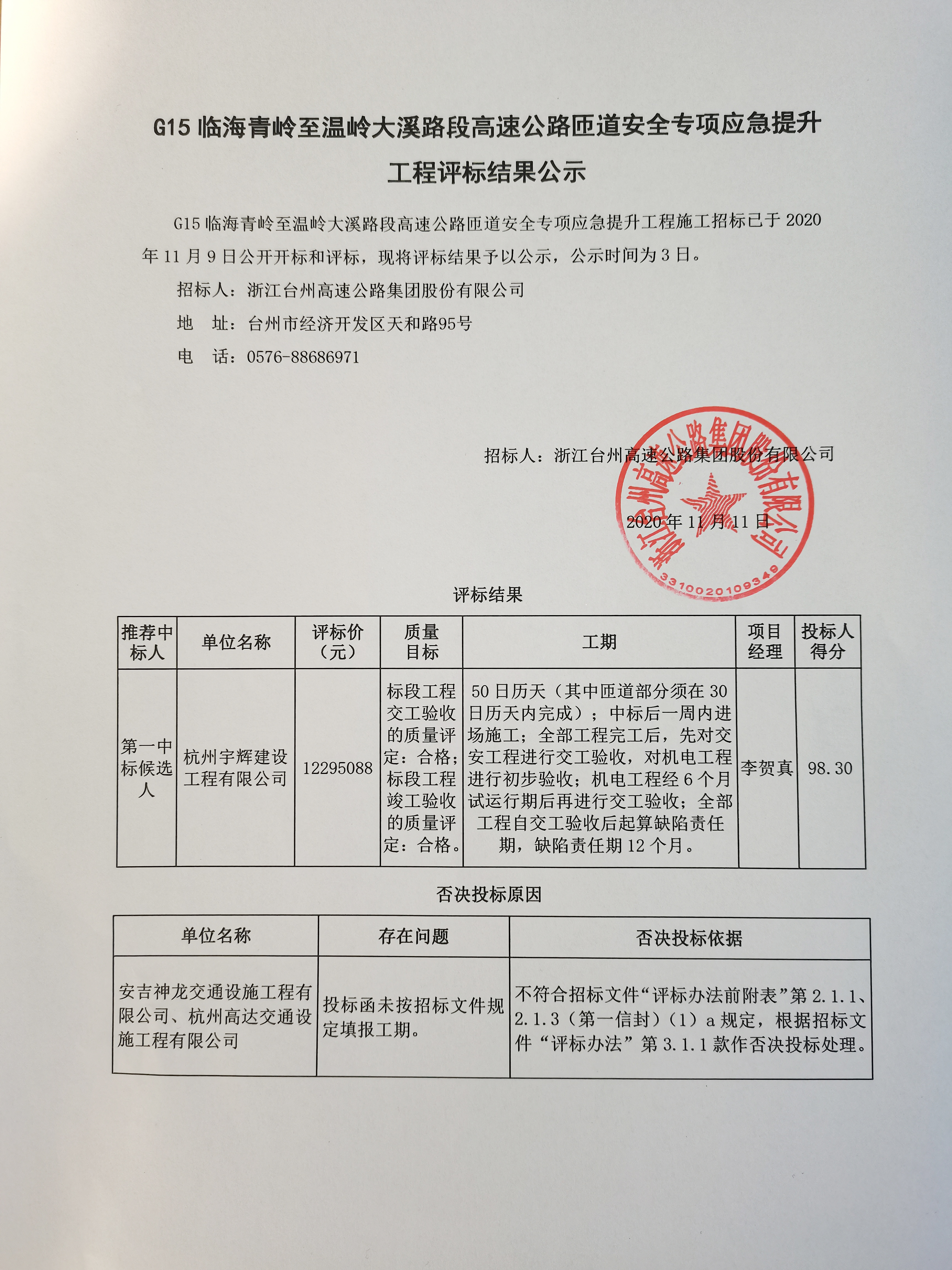 G15臨海青嶺至溫嶺大溪路段高速公路匝道安全專項(xiàng)應(yīng)急提升工程評(píng)標(biāo)結(jié)果公示