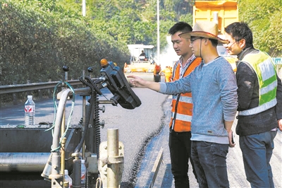 “路面銑刨時有時會出現銑刨不完全存在夾層的現象,如不清理干凈則會嚴重影響攤鋪后路面的平整度。”楊金梁介紹道,所以攤鋪時每道工序,他都時刻緊盯,確保攤鋪的路面不存在任何瑕疵。