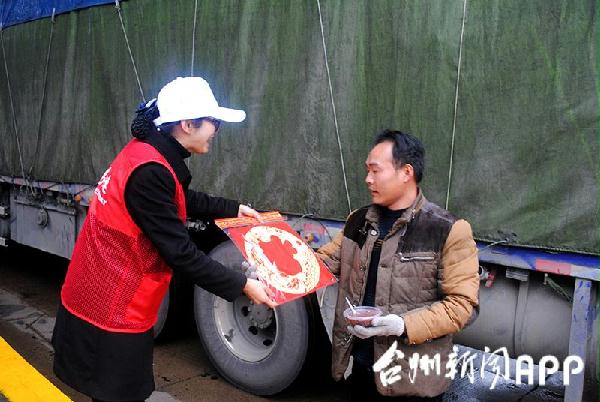圖為志愿者為司機(jī)送上“福”字。鄭瑛芝攝