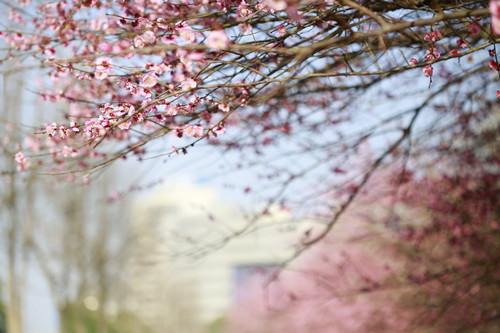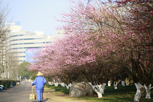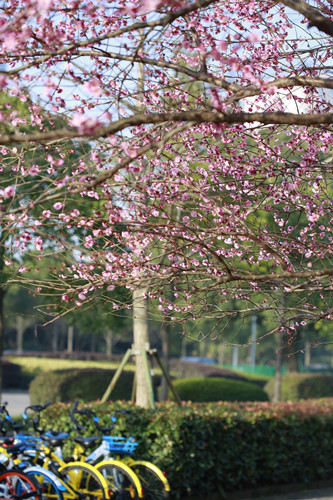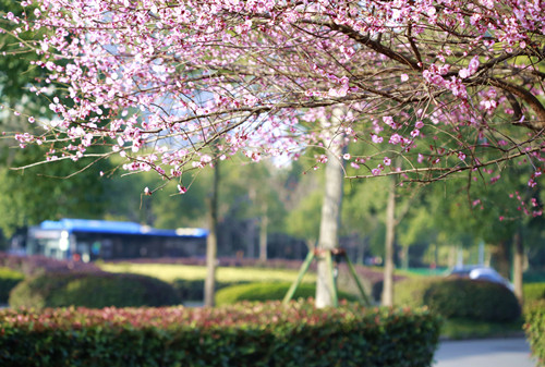 最后一站,便是市民廣場,我見過的最美公交站臺。初春的清晨啊,一下車便有沁香拂散,迎接我下車的那是大片繁花盛開呀,路邊草地一溜的紅梅、白梅,在藍天下絢爛地肆無忌憚地綻放。呵,是的,還有藍天,最近流行的一個詞叫“臺州藍”,忽然想起來,每日公交車上下班,低碳出行,這算是我為“臺州藍”添了一筆淡藍嗎?應該是吧。于是,在藍天紅白花海中,慢慢穿過梅林、小橋、亭子,上班之路竟是如此心情舒緩。