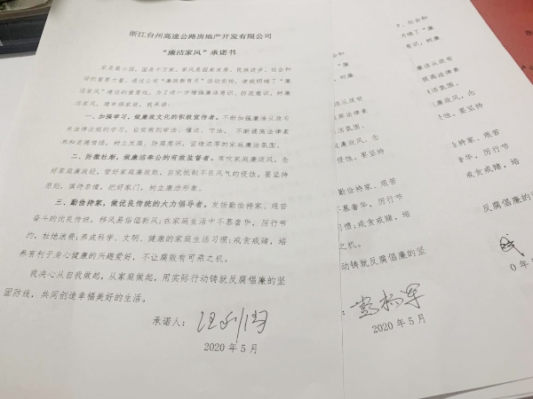 圖為全體黨員觀看廉政教育短視頻《國畫》  圖為簽訂“廉潔家風”承諾書 根據集團公司《關于組織開展“廉政教育月”活動的通知》文件要求,為推動“不忘初心、牢記使命”主題教育常態化,深入學習貫徹黨的十九大和十九屆二中、三中、四中全會及十九屆中紀委四次全會精神,嚴守黨的政治紀律和政治規矩,更好地落實黨風廉政建設有關要求,高速房產公司黨支部組織了這次專題活動。全體參會人員一起觀看廉政教育視頻,宣讀“廉潔家風”倡議書,簽訂“廉潔家風”承諾書,開展“廉潔文明家風,黨員干部示范”大討論。 此次黨風廉政專題活動進一步增強了黨員干部的廉潔意識、防范意識,起到帶頭正品行、立家規、嚴家教、樹家風建設的表率作用,以好家風促黨風帶社風民風,為新形勢下臺州高速房產事業貢獻力量。 鄭攀